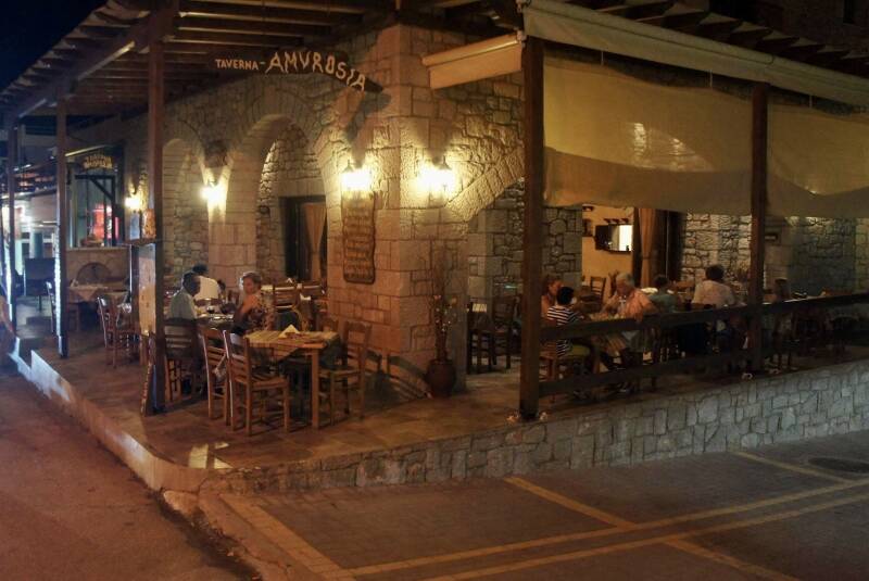 Traditionele Griekse Tavernes, supermarkten, apotheek, ijssalons, uitgerekte zandstranden,